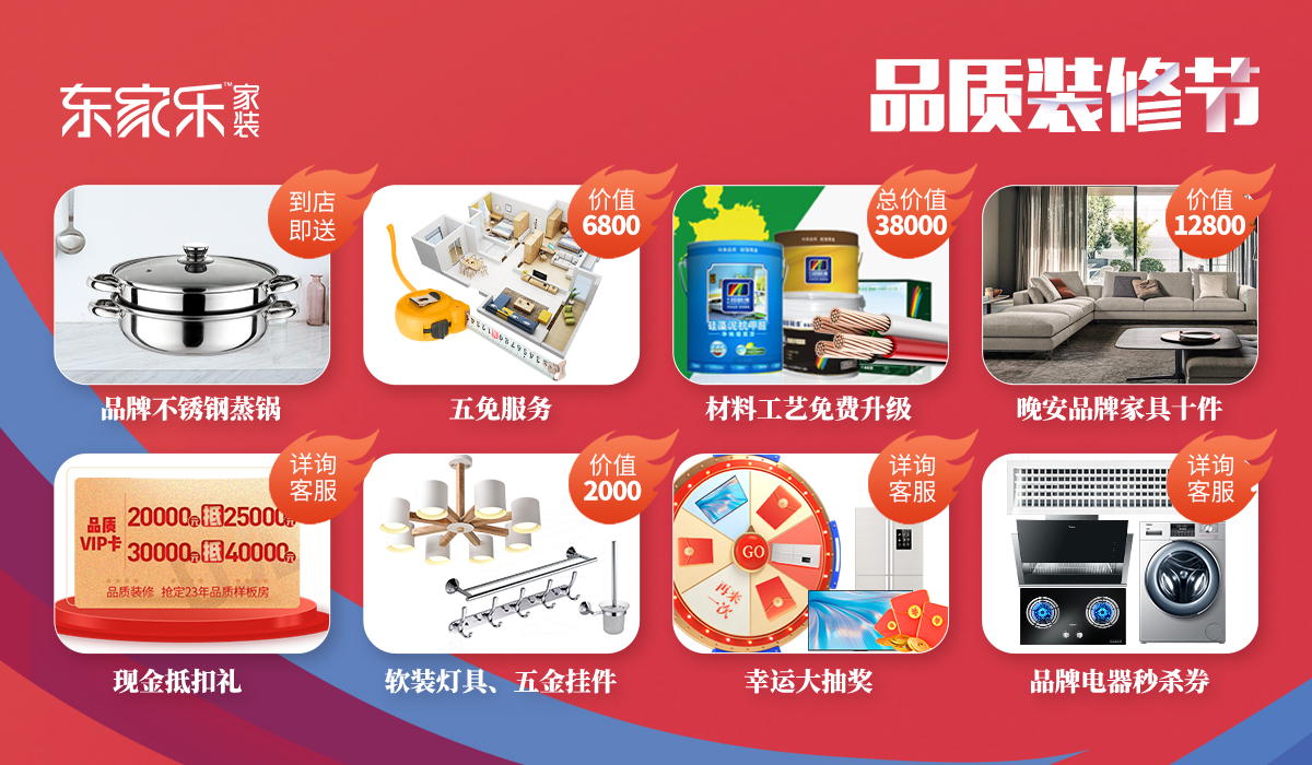 東家樂(lè)家裝聯(lián)合金杯電纜、多樂(lè)士、圣象地板、歐派、晚安家居、金意陶瓷磚、樂(lè)東家定制等數(shù)十家國(guó)內(nèi)知名品牌為廣大業(yè)主讓利,大量一線(xiàn)品牌材料免費(fèi)升級(jí),提升材料品質(zhì)但不提升價(jià)格。