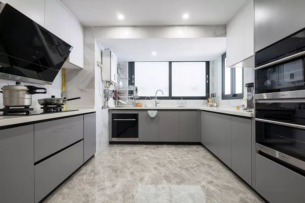 U型廚房則以強(qiáng)大的儲(chǔ)物能力為特色,在L型的基礎(chǔ)上增加了一側(cè)的工作臺(tái)面或高柜,從而擴(kuò)充了存儲(chǔ)空間,能夠容納更多的廚房設(shè)備和用具。U型廚房擁有良好的功能分區(qū)和流程合理性,支持多人同時(shí)操作。其櫥柜布局充分利用每一寸空間,形成一個(gè)高效的正三角形工作區(qū),使得灶具、水槽和冰箱得以高效協(xié)作,而寬敞的地柜提供了豐富的收納選擇。