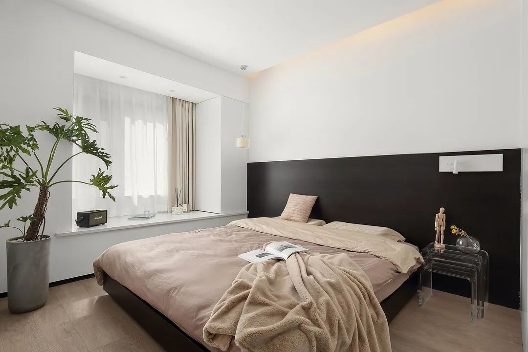 在整體明亮寬敞的空間布局下,淺灰色的墻體搭配半高的木飾面,床頭的背景墻簡潔而素雅,呈現(xiàn)出低調(diào)卻不簡單的質(zhì)感。